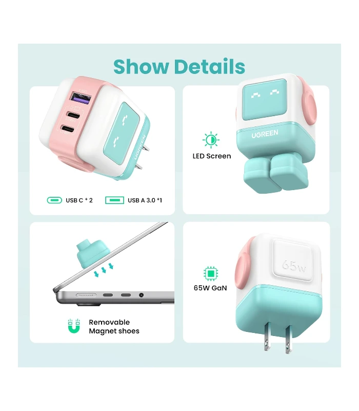 $30.00UGREEN Uno 65W — Cargador de 3 puertos GaN, carga rápida, 2 puertos USB-C, 1 puerto USB-A – Menta