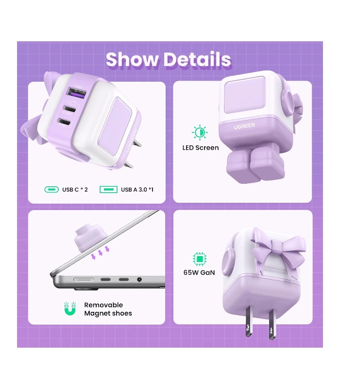 $50.00UGREEN Uno 65W — Cargador de 3 puertos GaN, carga rápida, 2 puertos USB-C, 1 puerto USB-A – Lila
