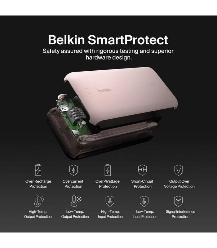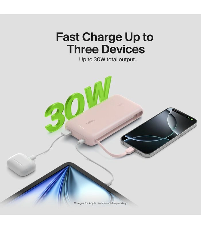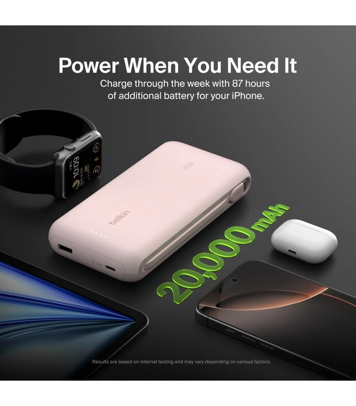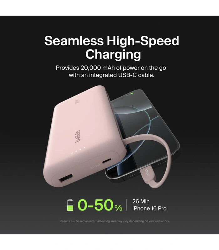 Belkin Power Bank 20K Pink — Cargador portátil, hasta 30W, cable USC-C integrado, rosa