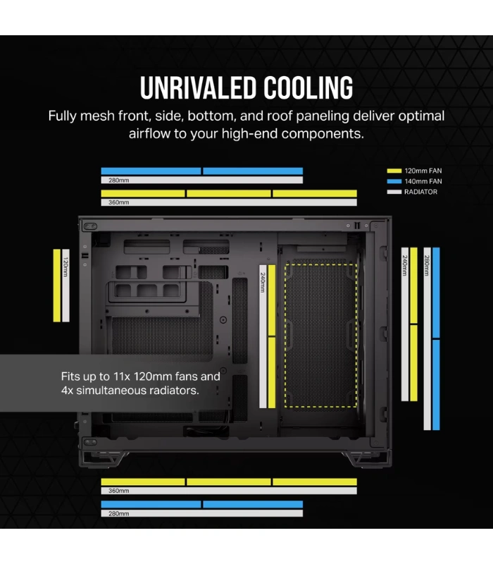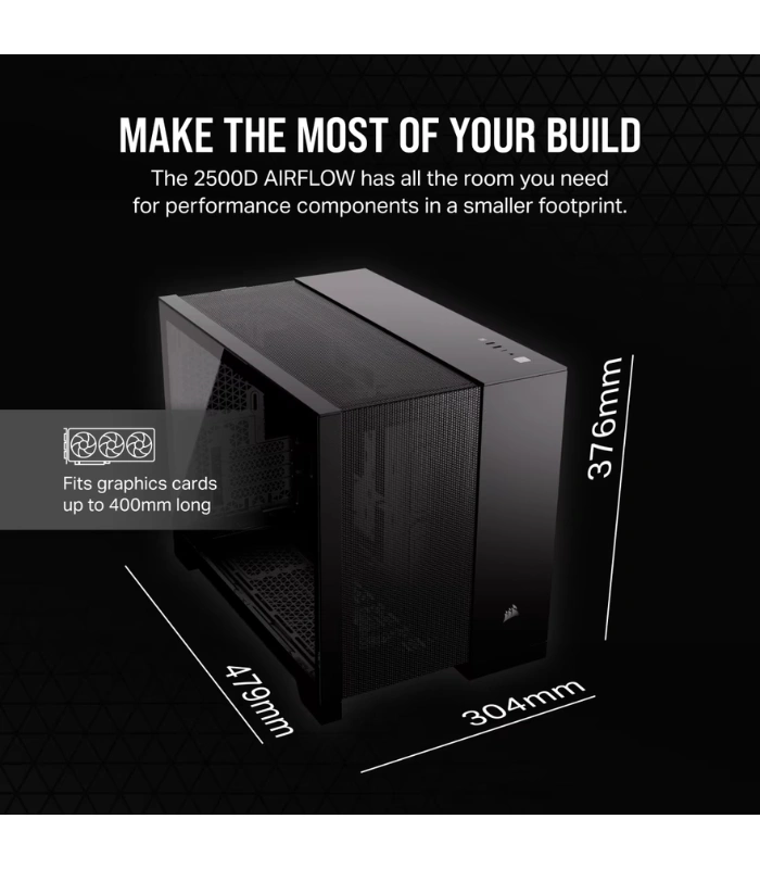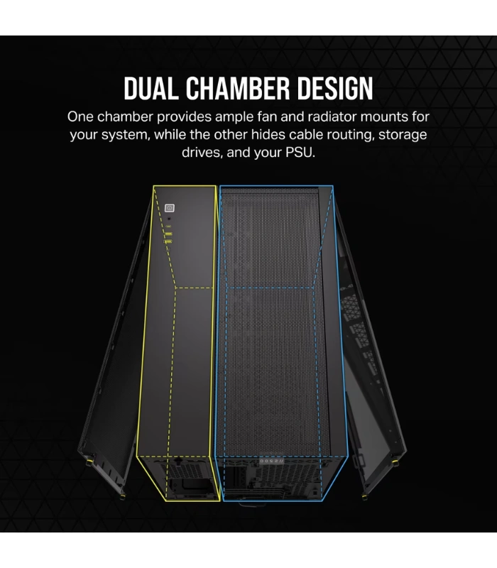 El chasis para PC de dos cámaras semitorre CORSAIR 2500D AIRFLOW ofrece un flujo de aire y refrigeración excepcionales con paneles completamente de malla y un diseño de doble cámara lograr un diseño organizado e impresionante.