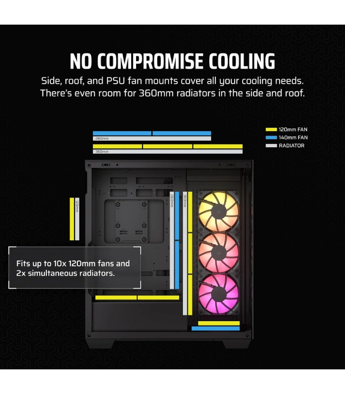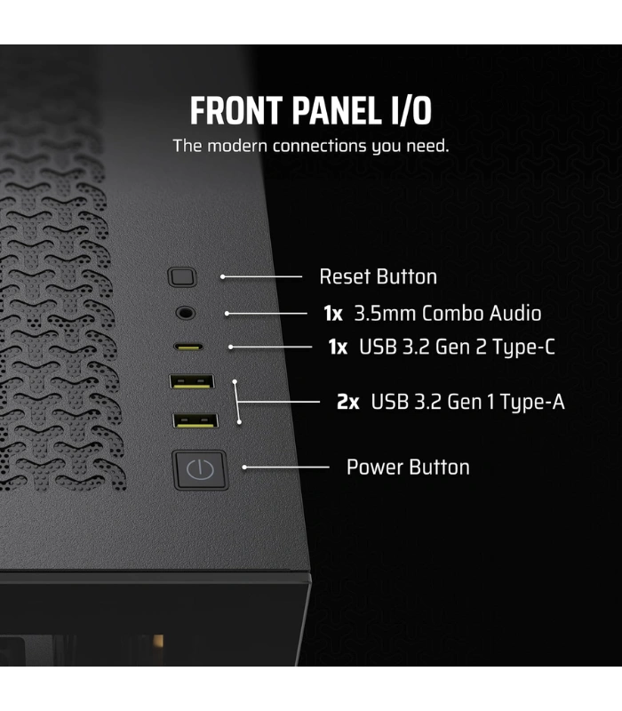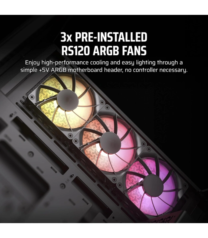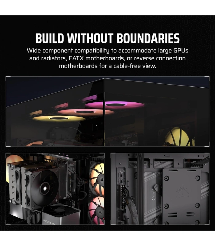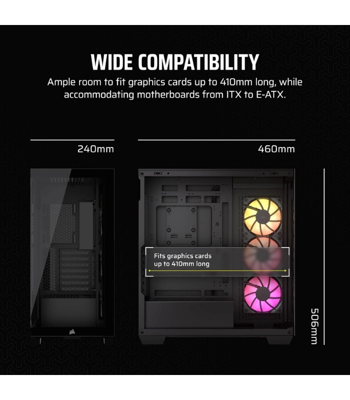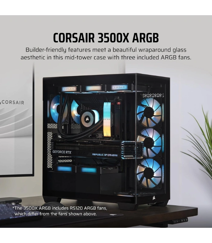 El chasis para PC de cristal CORSAIR iCUE LINK Corsair 3500X ARGB semitorre combina elementos que facilitan el montaje con una impresionante estética de cristal envolvente y el potencial de refrigeración necesario para un PC espectacular.
