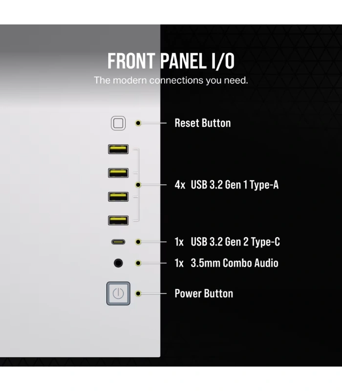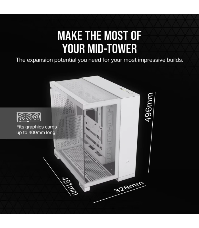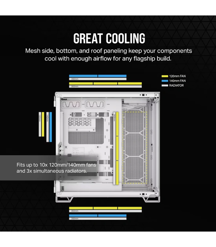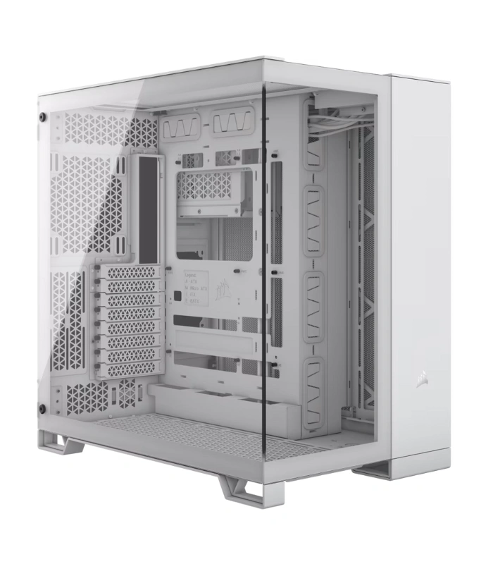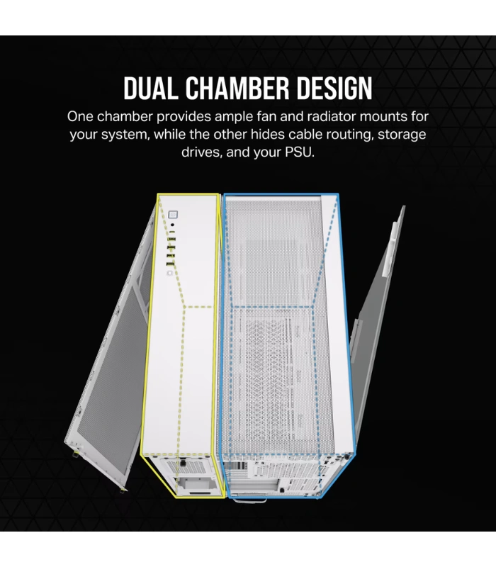 El chasis para PC de dos cámaras semitorre CORSAIR 6500X ofrece un flujo de aire y refrigeración excepcionales con paneles completamente de malla y un diseño de doble cámara lograr un diseño organizado e impresionante.