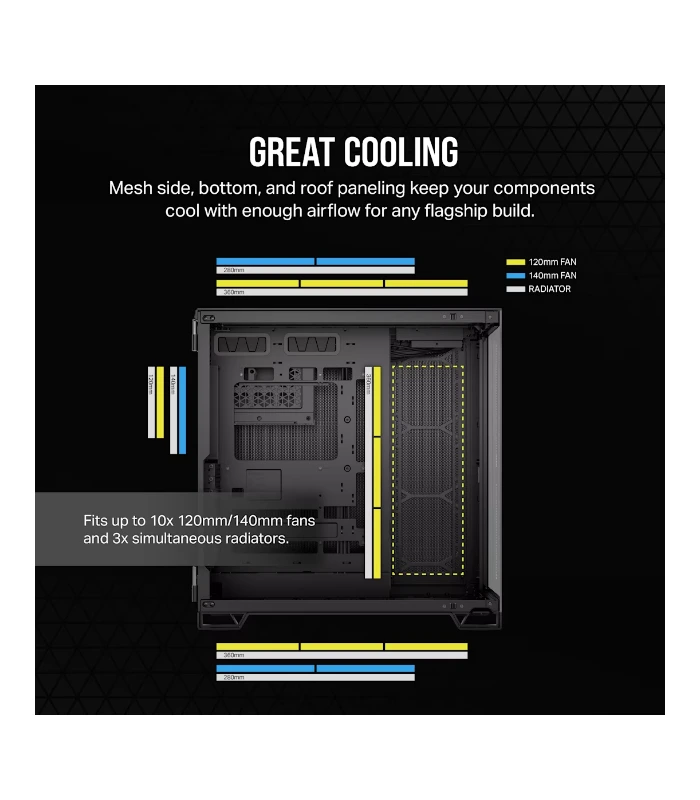 • Opciones de Refrigeración: Gran flexibilidad con espacio para hasta 10 ventiladores de 120 mm o 7 de 140 mm, y radiadores de hasta 360 mm.