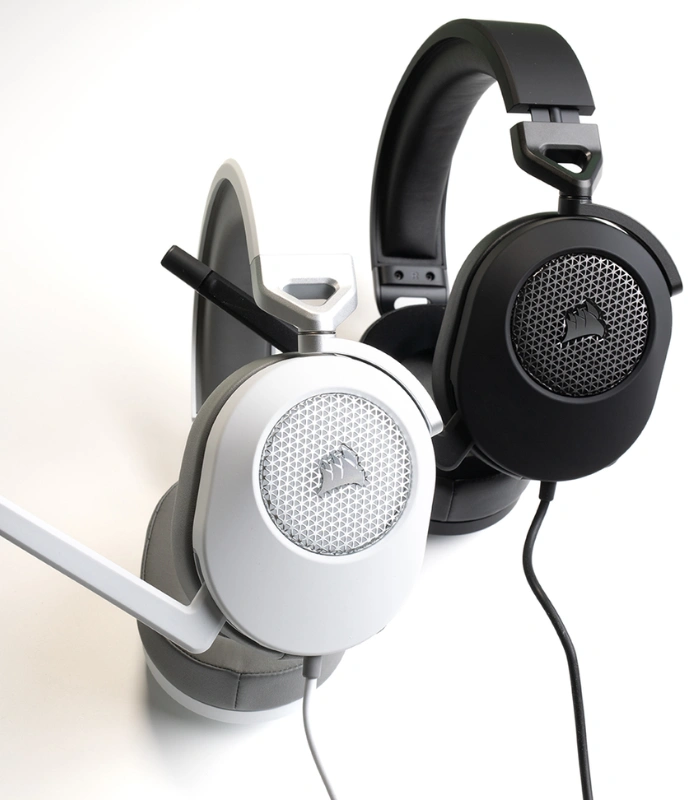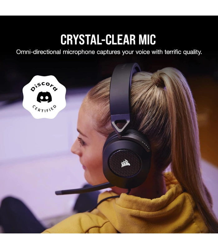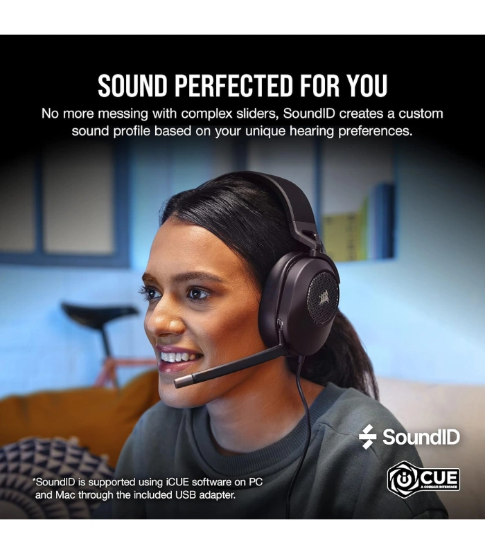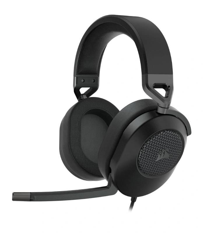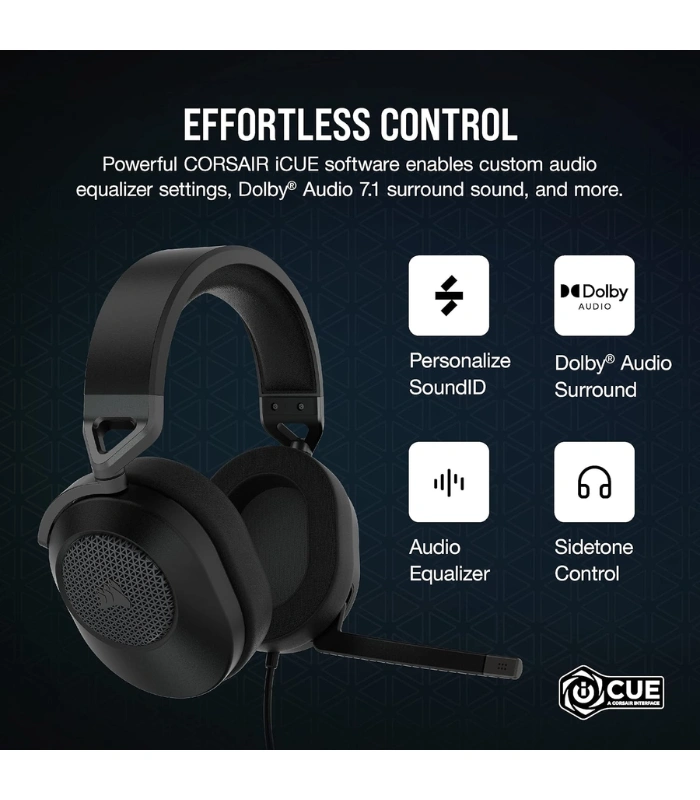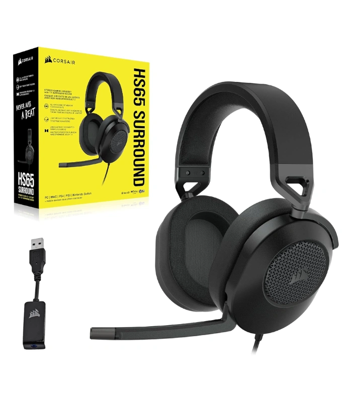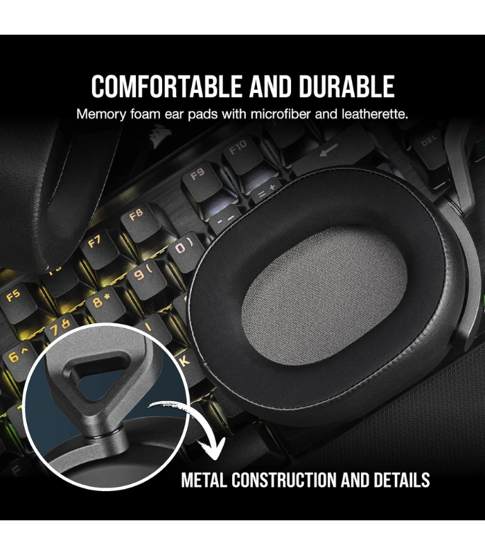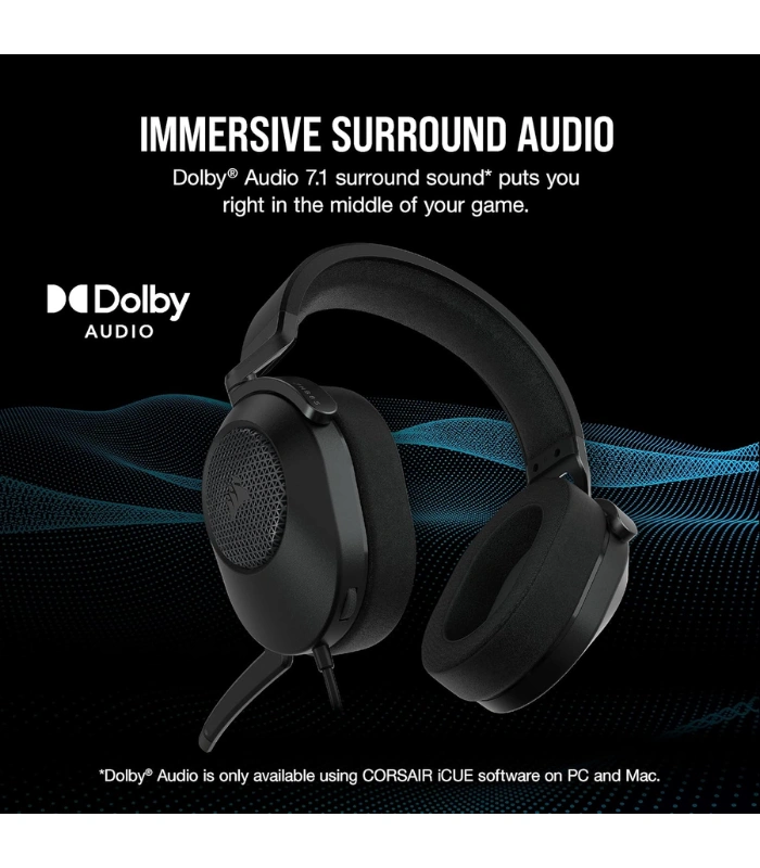 Los auriculares para juegos CORSAIR HS65 SURROUND ofrecen comodidad y sonido durante todo el día con almohadillas de memoria viscoelástica y polipiel, un diseño ligero reforzado con aluminio y el sonido envolvente Dolby Audio 7.1 en PC y Mac.