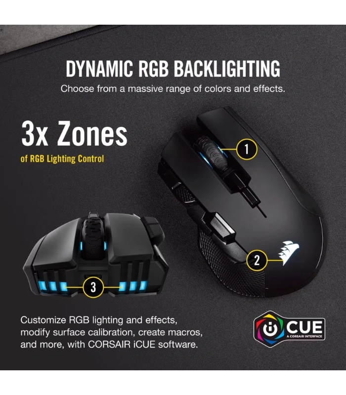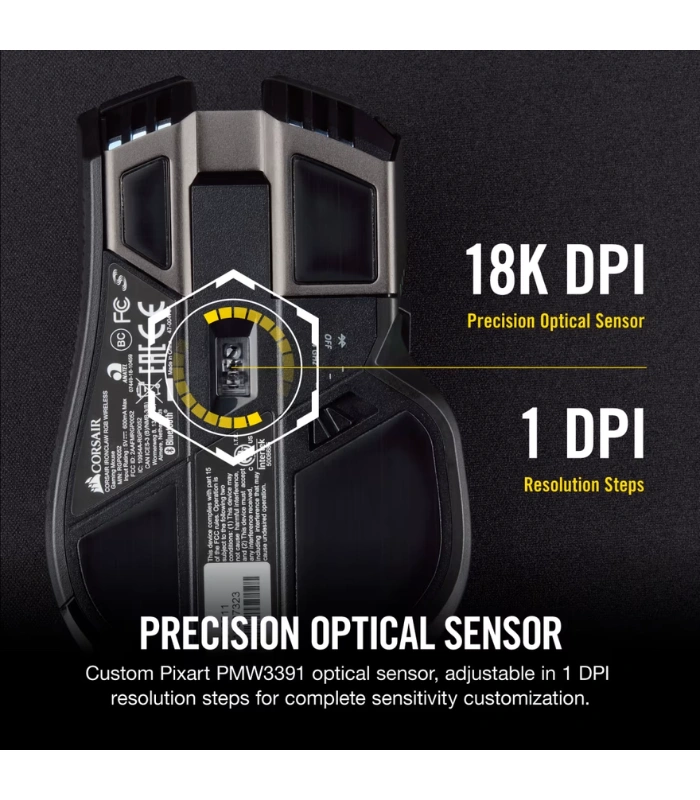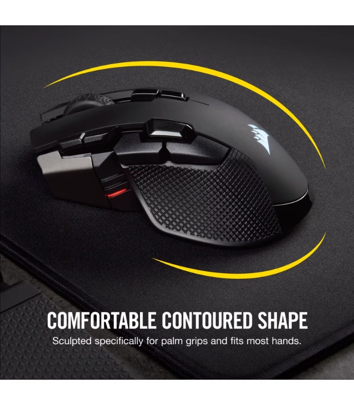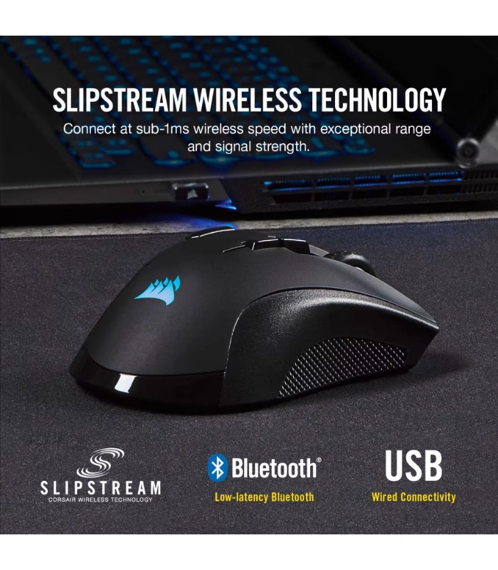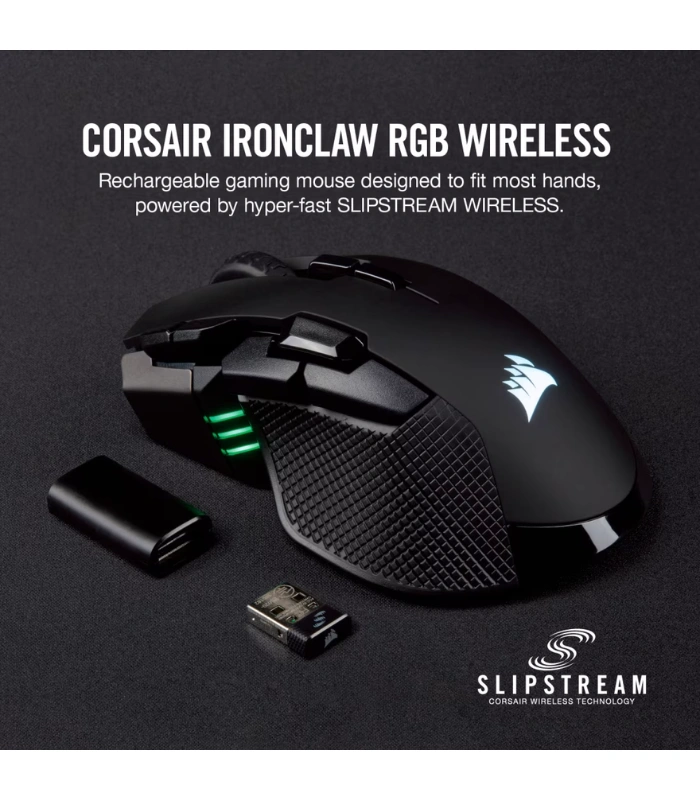 El ratón de juego CORSAIR IRONCLAW RGB WIRELESS combina un sensor óptico de 18 000 ppp nativos con un cómodo agarre para la palma. Puede conectarlo fácilmente al PC a través de una tecnología ultrarrápida, la TECNOLOGÍA SLIPSTREAM CORSAIR WIRELESS en menos de 1 ms, Bluetooth o conexión por cable USB.