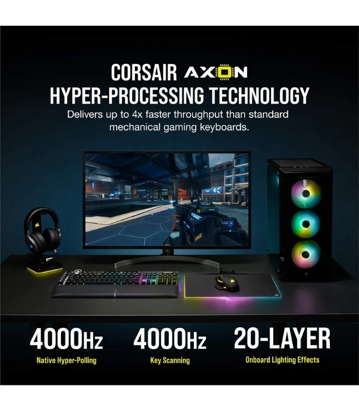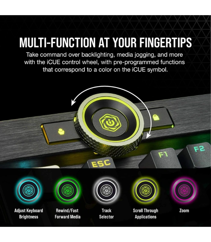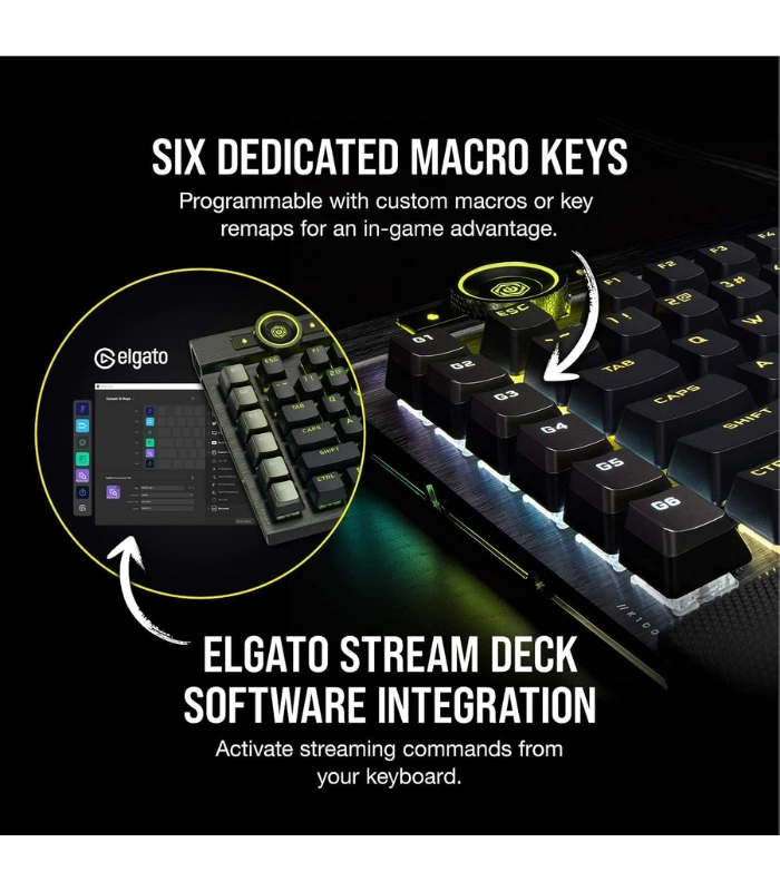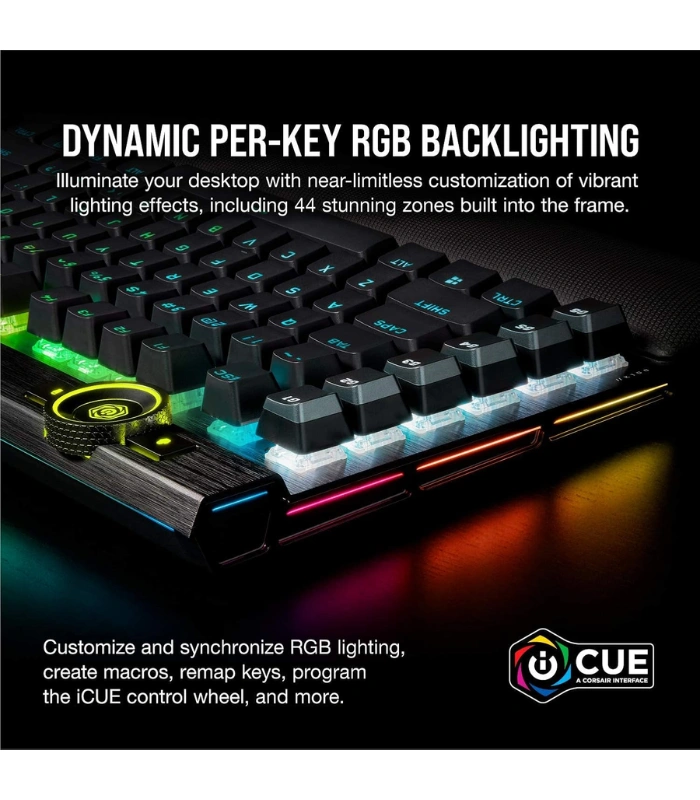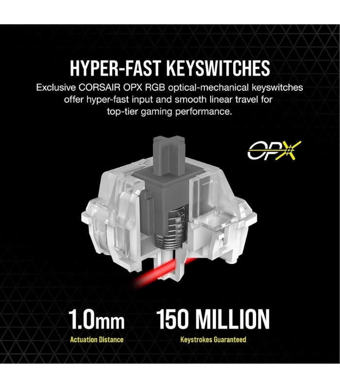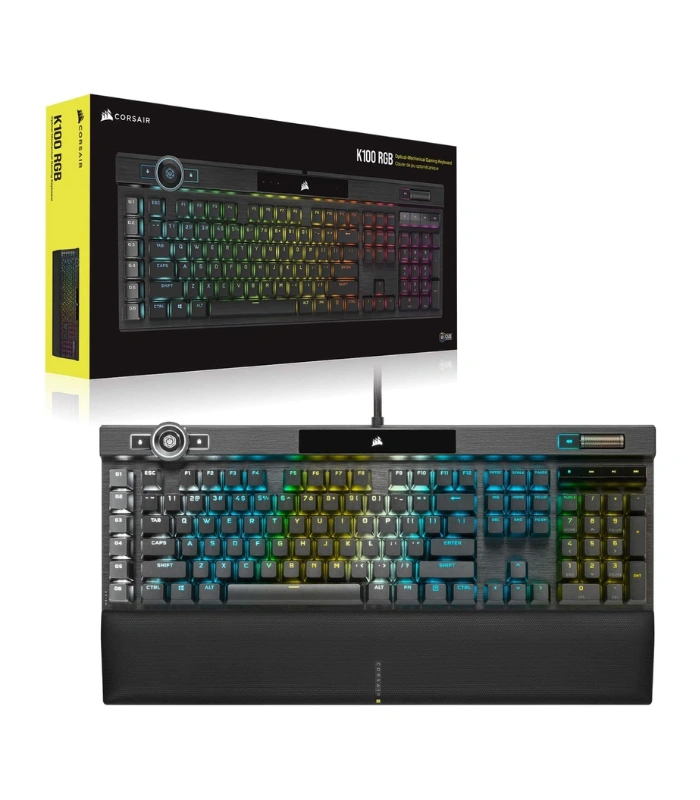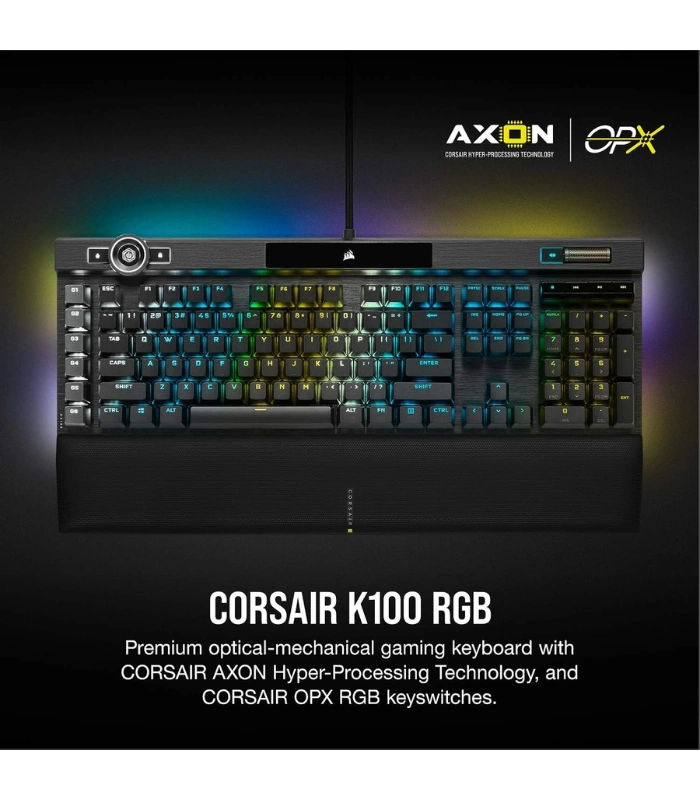 El incomparable teclado mecánico y óptico para juegos CORSAIR K100 RGB combina un impresionante diseño de aluminio, iluminación RGB en cada tecla con la potente tecnología de hiperprocesamiento CORSAIR AXON y los interruptores de teclas CORSAIR OPX RGB.