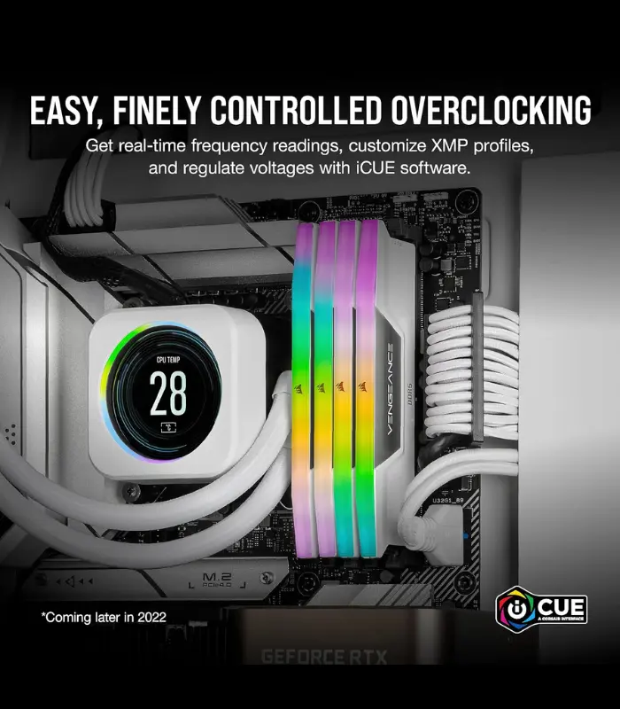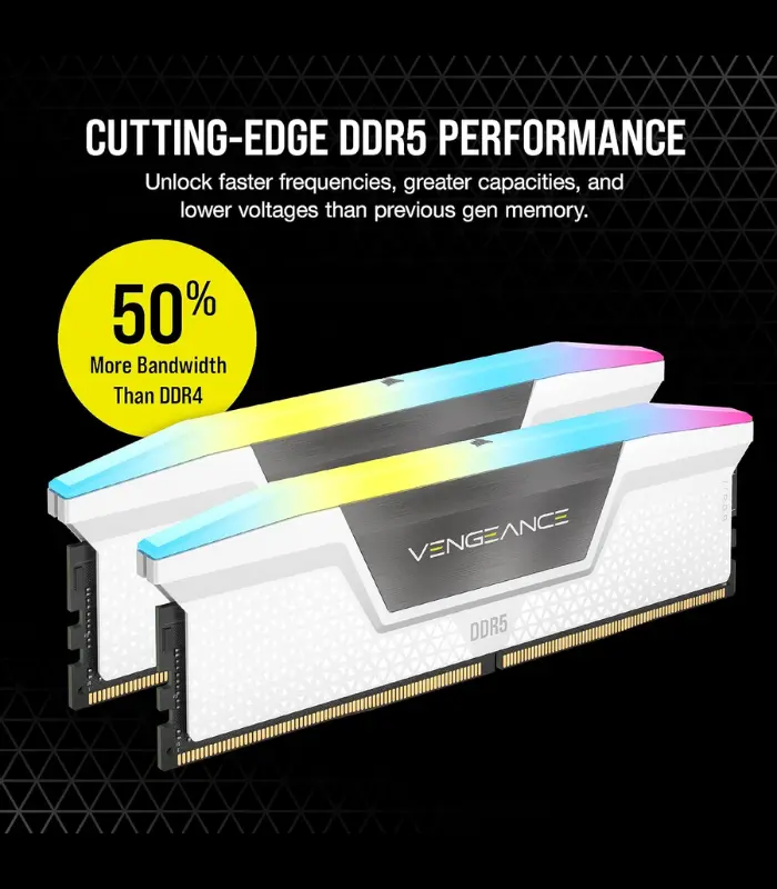 El kit de memoria CORSAIR Vengeance RGB de 32 GB y 6000 MT/s en color blanco mejora la capacidad multitarea de tu sistema. Este kit de dos módulos te permite disfrutar de juegos fluidos, renderizar proyectos digitales más rápido y optimizar tu carga de trabajo.