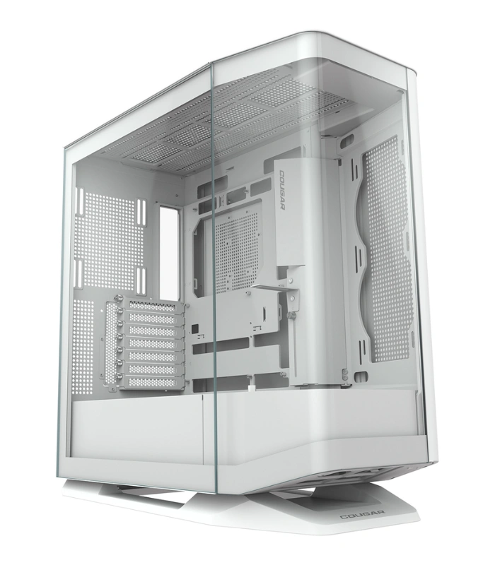El perímetro poliédrico inspirado en prismas de torre media Cougar FV270, formado por vidrio curvado templado, permite una vista interior panorámica inigualable de su estructura en todo su esplendor, mientras que la orientación en ángulo de los ventiladores revoluciona la dinámica del flujo de aire.