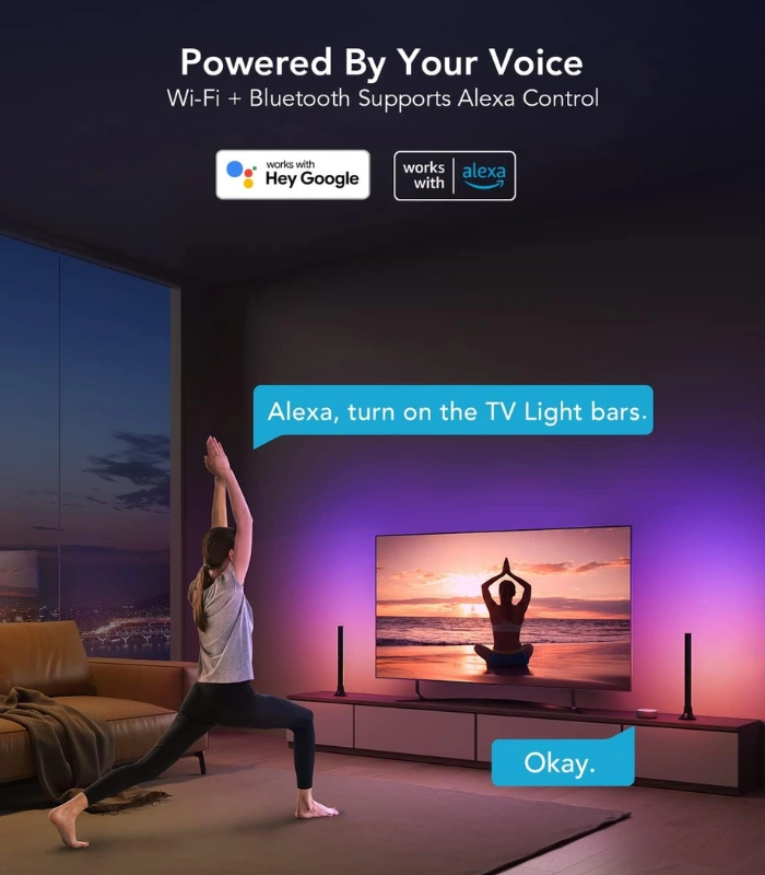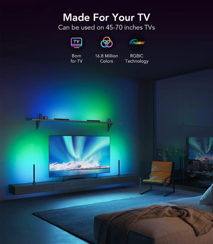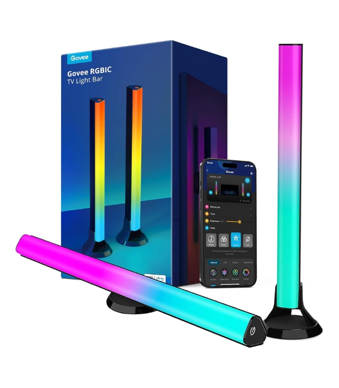 Estas barras de luz para TV Govee RGBIC TV Light Bars crean una experiencia visual inmersiva gracias a la potente tecnología RGBIC. Con una aplicación inteligente y control por voz, personaliza las luces para que representen tu estilo.
