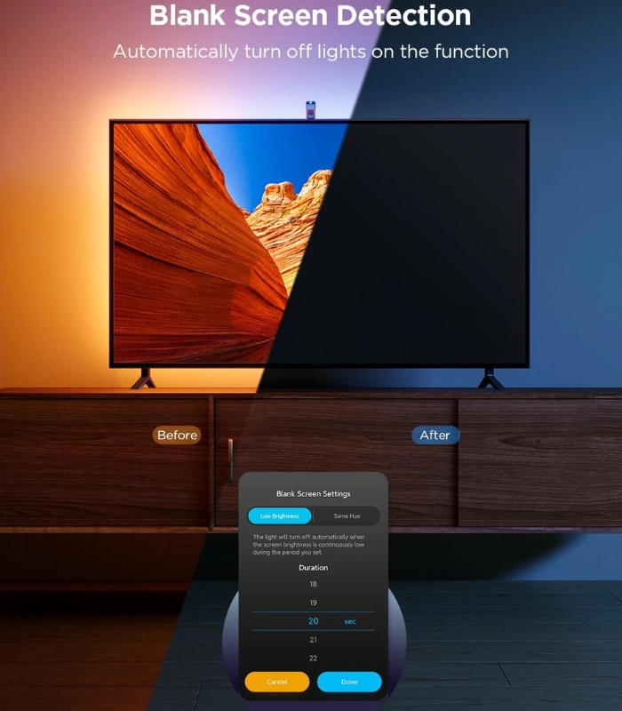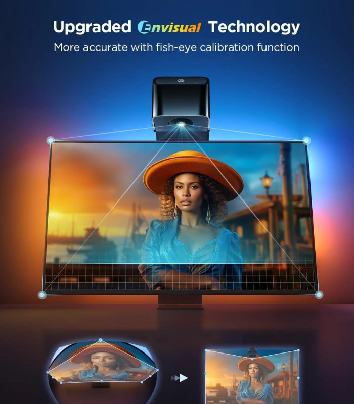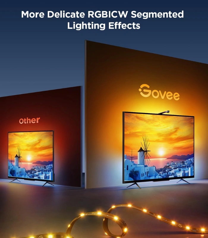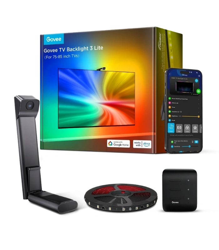 Disfruta de imágenes inmersivas con Govee TV Backlight 3 Lite. Este conjunto incluye corrección de ojo de pez, eliminación de efecto panorámico, compatibilidad con televisores ultrafinos y mucho más. ¡Lleva tu contenido de pantalla al siguiente nivel!