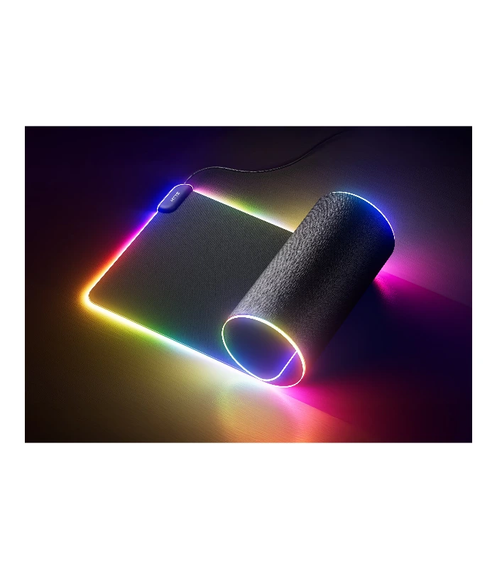 El HYTE CNVS Intense Play Mat, un tapete para escritorio de gran tamaño diseñado para gaming que destaca por su sistema de iluminación qRGB integrado de 50 píxeles.
