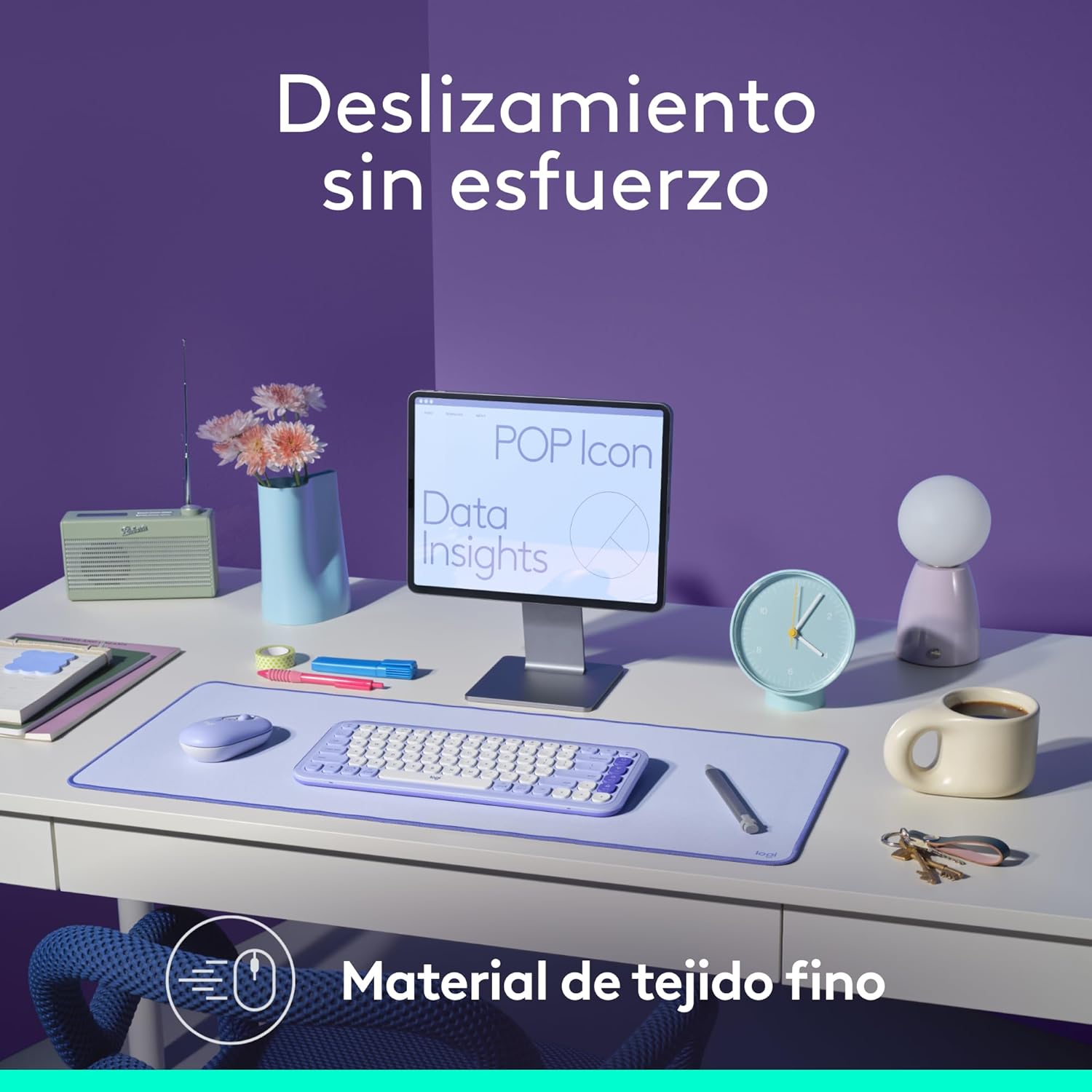 La Logitech Desk Mat Studio Series es un protector de escritorio de gran formato diseñado para aportar estilo y protección a tu espacio de trabajo. Se destaca por su superficie resistente a salpicaduras, base antideslizante y construcción con materiales reciclados.