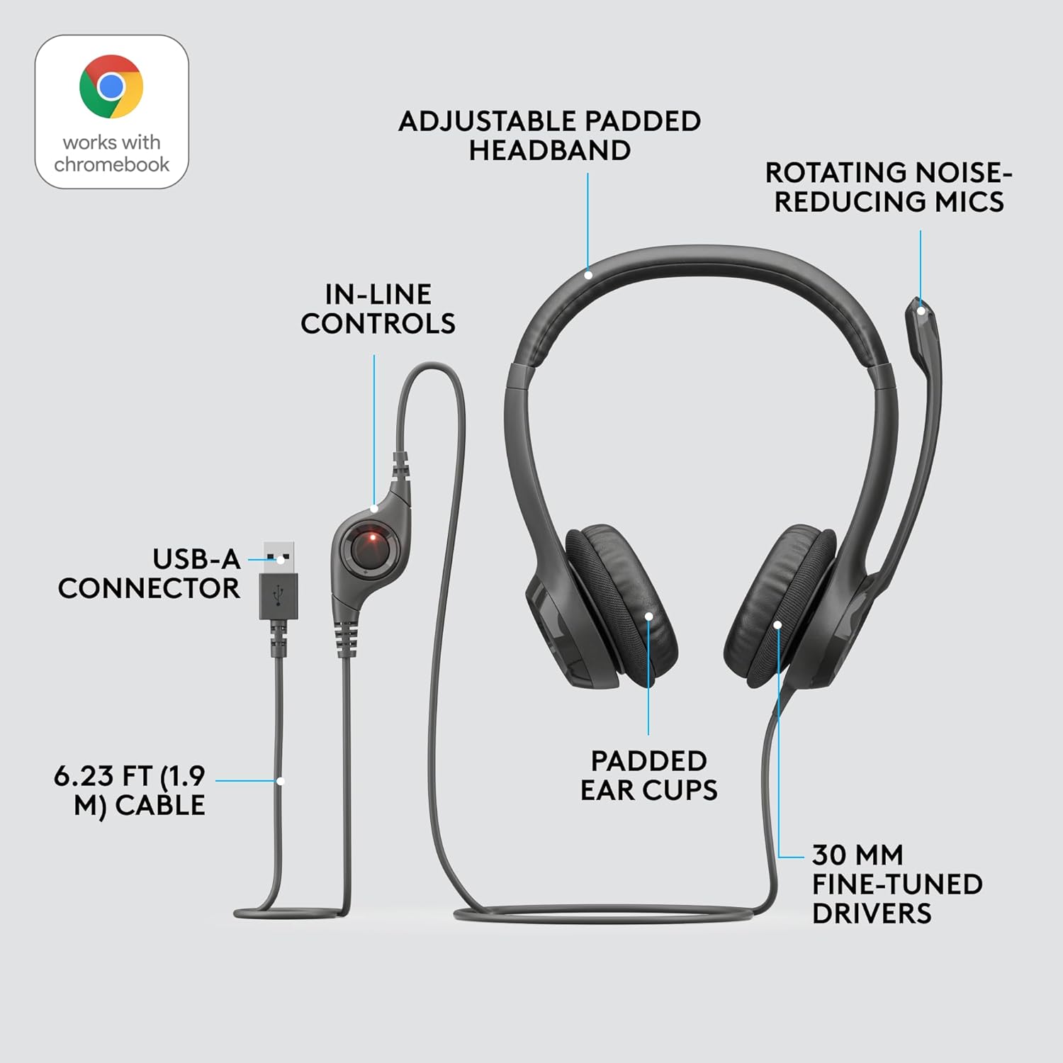 Experimenta un audio nítido para videoconferencias, música y más con una simple conexión USB plug-and-play y un micrófono con cancelación de ruido en tus auriculares Logitech H390.