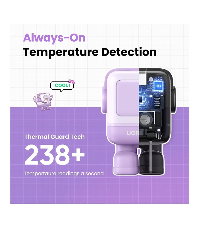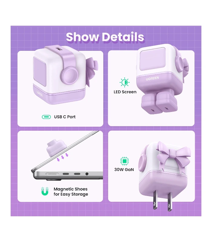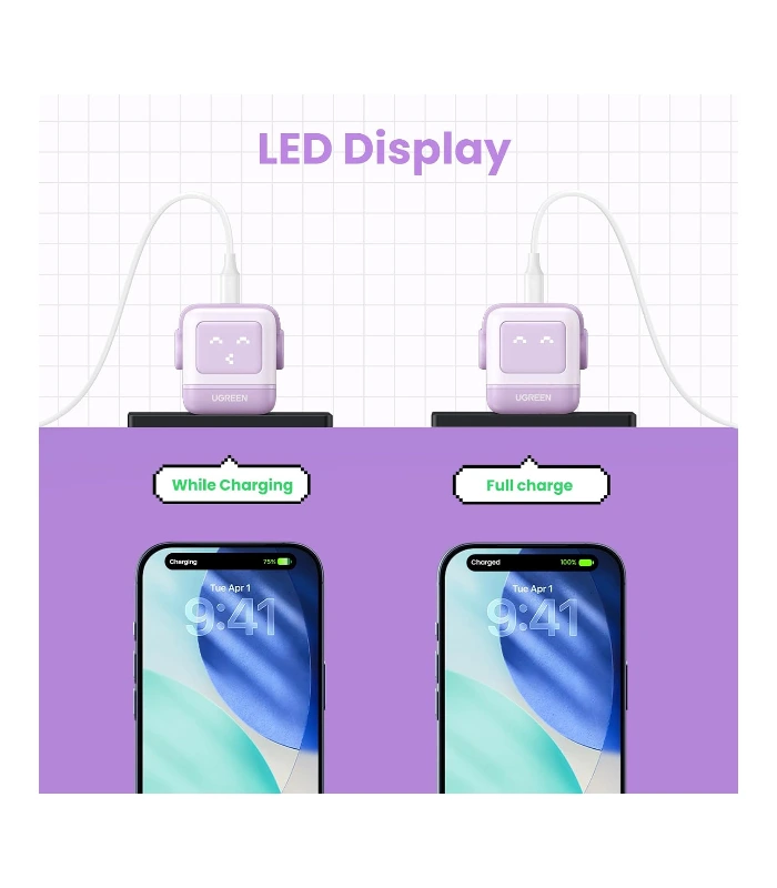 El UGREEN Uno 30W (también conocido como Nexode RG 30W) es un cargador de pared compacto con tecnología GaN que destaca por su diseño en forma de pequeño robot. Cuenta con una pantalla LED que muestra expresiones faciales para indicar el estado de carga en tiempo real.